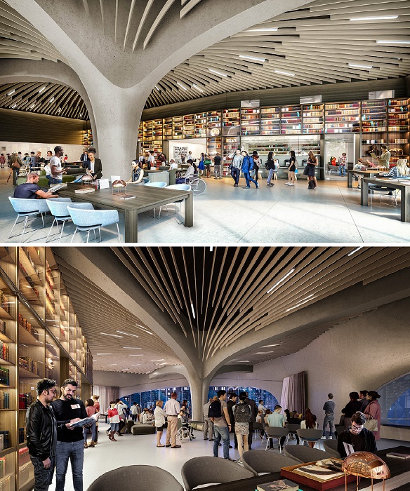 Научная библиотека и учебный центр Готтесмана позволяют ознакомиться с многомиллионными печатными и цифровыми ресурсами (концепт Центра науки Гилдера).