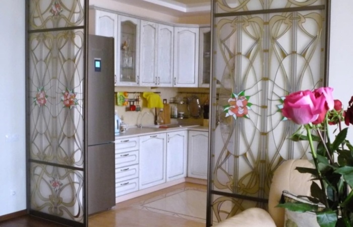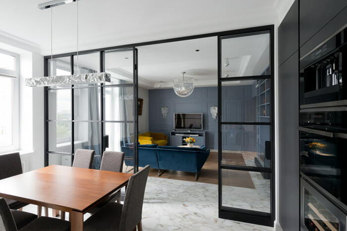 Стеклянная перегородка в кухне. / Фото: dizajn-gostinoj.com