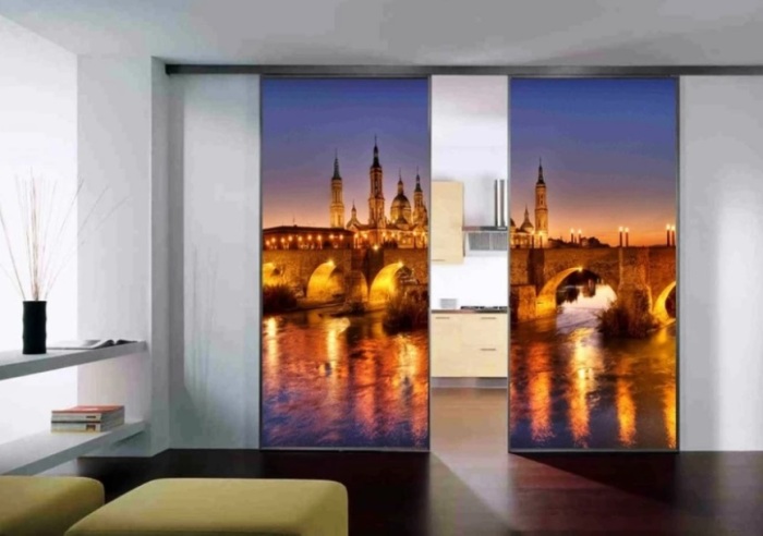 • Зеркало. Оно может занимать всю створку или быть лишь частью полотна перегородки. На стекло можно наносить зеркальную пленку. Ее сочетание с прозрачной поверхностью стекла считается особенно удачным. • Пескоструйный рисунок. Он наносится с помощью распыления абразивного материала на поверхность стекла. Такую операцию проводят только с тонированным, прозрачным и зеркальным видами стекол. В итоге можно получить матовый фон с гладким изображением, либо матовый рисунок на прозрачном фоне.