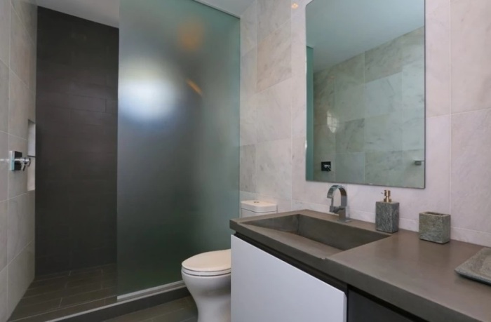 Зонирование стеклянной перегородкой в ванной комнате необходимо для отделения мокрой зоны душевой или сауны. Здесь в ход идут как полностью прозрачные полотна, так и матовые или тонированные, что добавит конфиденциальности. В этих же целях можно использовать панели из гофрированного стекла или с пескоструйным рисунком.