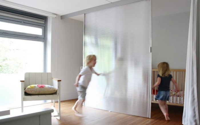 В комнате для двух и более детей индивидуальные зоны можно разграничить, а заодно и украсить стеклянной перегородкой с оригинальным декором или оттенком. Для безопасности панель из стекла лучше облачить в рамы и выбирать максимально прочные материалы (триплекс, закаленное или стеклоблоки).