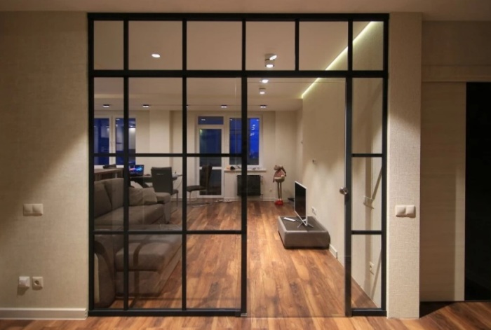 Стеклянная перегородка в гостиной. / Фото: remontbp.com