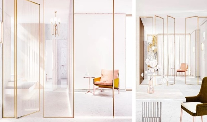 Перегородки с тонкими золотистыми рамами выглядят роскошно и изысканно.