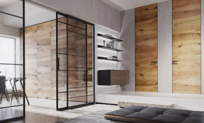 • Подсветка. Стекло можно дополнить цветной или нейтральной подсветкой с разных сторон. С ней стеклянные перегородки в квартире смотрятся более эффектно и становятся дополнительным источником освещения. • Смарт-стекло. Это одна из последних разработок в стеклянной промышленности. Благодаря электрохромной жидкокристаллической пленке и электричества можно через пульт управления или гаджеты превращать прозрачное стекло в матовое, и наоборот. • Металлическое обрамление. Перегородки из стекла в металлической раме добавляют в интерьер графичности. Золотистые, серебристые или медные рамы сделают пространство роскошным и респектабельным. Линии из черных металлов –урбанистический штрих, уместный во многих современных стилях.