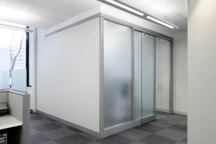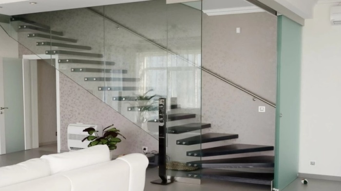 • Стационарные. Их закрепляют к стенам, полу и потолку с помощью алюминиевых или стальных профилей, которые обеспечивают стеклянным полотнам полную неподвижность. Конструкции бывают прямые или радиусные. В зависимости от плотности стекла перегородки отличаются повышенной прочностью, тепло- и звукоизоляцией. • Раздвижные . Состоят из подвижных створок, которые перемещаются по рельсовым направляющим и выполняют функцию дверей. Способы раздвижения зависят от типа, площади и конфигурации помещения. В отличие от распашных дверей раздвижные перегородки экономят место. Конструкции с ведущим верхним профилем удобнее и проще в установке, но нужна основательная опора на потолке, а механизмы с нижним ведущим профилем – более устойчивы, поскольку нагрузка приходится на пол.