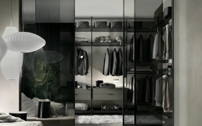 Стеклянной перегородкой в спальне можно эффектно оформить гардеробную и возвести стену с дверью, ведущей на утепленный балкон. В однокомнатных квартирах перегородка поможет обозначить зону для сна в гостиной. Довольно неоднозначное решение – прозрачная стена между ванной и спальней. Для приватности стекло дополняют матовым напылением или шторами.
