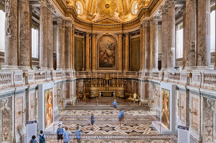 Интерьер Палатной капеллы подстать оформлению королевской резиденции (Palazzo Reale di Caserta, Италия). | Фото: keywordbaskets.com.