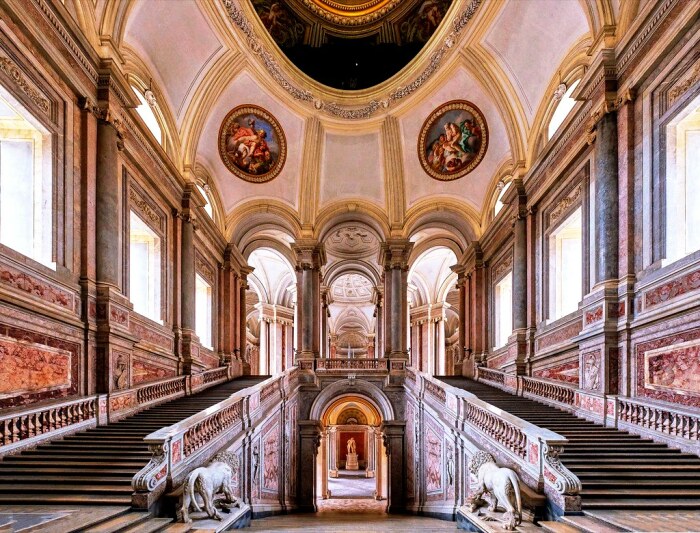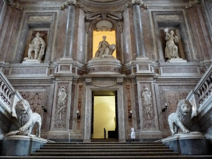 Особым украшением интерьеров дворца стали фантастические лестницы (всего их было создано 34). Чего только стоит двухсветная, охватывающая два этажа Парадная лестница (Scalone d’onore) из белого каррарского мрамора, эффектно контрастирующего с разноцветным мрамором, которым облицованы стены. Навстречу поднимающимся, от входа, с каждой стороны лестницы установлены две скульптуры грозных львов работы Паоло Персико и Томмазо Солари, символизирующих «силу оружия и разума». Культовая лестница стала не просто главным шедевром, созданным архитектором Ванвителли, она является ярким примером классических многомаршевых лестниц, присущих эпохе барокко. Считается, что такой тип лестничных маршей олицетворяет движение из тьмы (полумрак первого этажа) к свету, поступающего из окон верхней площадки. Этим они отличаются от полностью закрытых лестниц Средневековья. Примечательно: Королевский дворец в Казерте стал эталоном для подражания. Подобная композиционная структура была использована Антонио Ринальди во время проектирования и строительства Мраморного дворца в Санкт-Петербурге, который начал возводиться спустя 15 лет. В Зимнем дворце Северной столицы можно увидеть Иорданскую лестницу, работы ученика Ванвителли – Б. Ф. Растрелли, в которой можно узнать черты Королевской лестницы Palazzo Reale di Caserta.