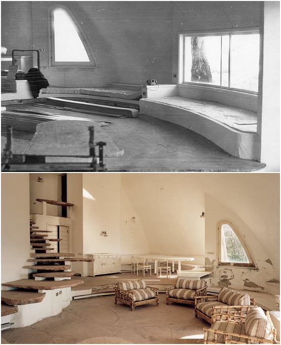 Всего в купольном доме влюбленных друг в друга и окружающий ландшафт знаменитостей, помимо гостиной-столовой и кухни обустроено пять «воздушных» спален и 4 ванные комнаты, соединенных между собой той самой каменной лестницей, проходящей через гостиную. Из спальни Антониони и Моники можно было выйти на террасу, где они принимали воздушные ванны и устраивали романтические вечера, наслаждаясь красотой открывающего пейзажа, который также был динамичным и ярким.