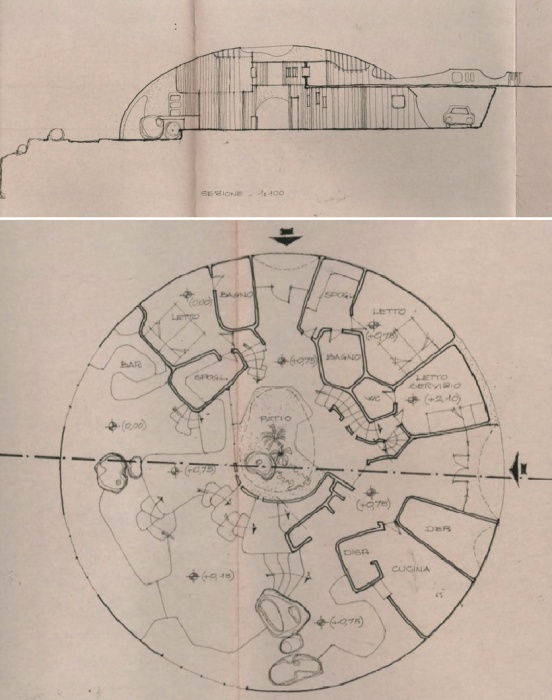 Довольно суровый, но в то же время прекрасный ландшафт как нельзя лучше подходил для создания уютного убежища, такого себе любовного гнездышка вдали от всеобщего внимания. Несколько лет ушло на приобретение участка и согласование проекта Дома-купола (La Cupola), который разработал один из самых известных архитекторов-новаторов ХХ века – Данте Бини (Dante Bini). К тому времени он уже прославился внедрением инновационных методик при возведении купольных/сферических домов бинишеллов (Binishell), представляющих собой «надувные» железобетонные конструкции. Именно такую технологию он использовал при строительстве дома для двух именитых представителей итальянского кино.