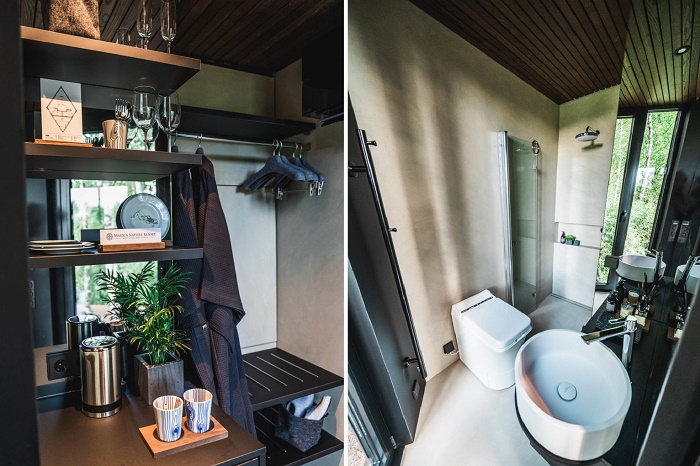 Задача дизайнеров студии заключалась в том, чтобы создать пространство, в котором любители отдыха вдали от городского шума могли беспрепятственно «созерцать хрупкость естественного, дикого и свободного мира» в комфортных условиях. Поэтому неудивительно, что в конструкции лесного домика KÄBI («Сосновая шишка») предусмотрены стеклянные стены и эффектные световые люки, которые помогают создать максимальную связь с природой,. Благодаря максимальному остеклению гости могут видеть небо и деревья, где бы они ни находились в номере. Этому поспособствовала и открытая планировка, единственные «ограничения» обзора создают лишь колонны, напоминающие стволы деревьев, в которых спрятаны душевая, туалет и системы хранения личных вещей постояльцев. Украшением интерьера домика является отделка из натурального дерева, масштабное остекление и солнечные лучи, создающие динамичные картинки, способствующие умиротворяющей и расслабляющей атмосфере.