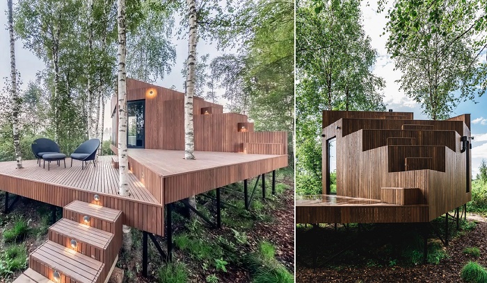 Деревянная платформа служит мостиком, открытой террасой и фундаментом для очаровательного лесного номера KASEKE (Maidla Nature Resort, Эстония). | Фото: interiordwelling.com.
