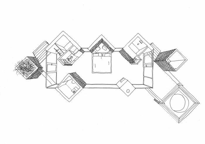 Планировка причудливого домика для отдыха «Сосновая шишка» на лоне природы (Maidla Nature Resort, Эстония). | Фото: maidlaresort.com.