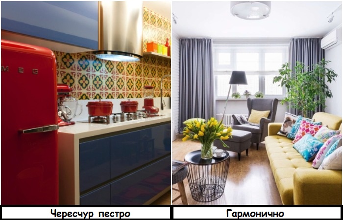 В интерьере не должно быть слишком много ярких цветов