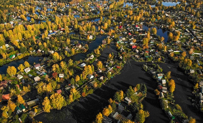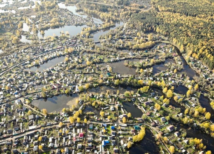 Подъезжая к Нижнему Тагилу по Серовскому тракту, можно увидеть множество садовых домиков, разбросанных на островах среди лабиринта водоемов и каналов («Уральская Венеция»). | Фото: uraloved.ru.