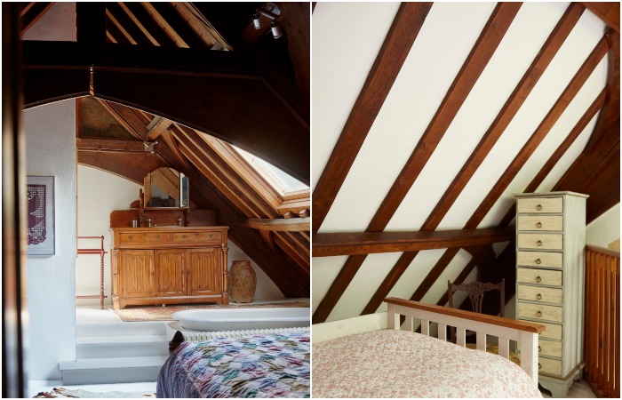 В бывшей церкви оборудовали 4 спальных и три ванных комнаты. Главная спальня занимает северный неф церкви, центральным элементом дизайна которой является ажурное окно с фиолетовым витражом. Остальные три спальни с двумя ванными комнатами (одна ванна находится рядом с гостиной) находятся на втором уровне, адаптированным под жилое пространство. Несмотря на то, что эти комнаты появились во время трансформации, их интерьер перекликается с общим дизайном жилых помещений, в которых угадываются исторические нотки: обилие деревянных элементов, открытые балки, дровяной камин, стрельчатые окна и витражи.
