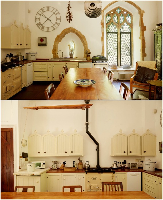 Просторная кухня с добротной мебелью и современной техникой порадует новую хозяйку (Саффолк, Великобритания). Столь же внушительные пропорции достались и кухонному пространству, расположенному рядом с гостиной. Мебельный гарнитур кремового цвета, в оформлении которого можно увидеть готические элементы (арочная форма дверей навесных шкафов, например), рабочие поверхности из натурального дерева, дровяная печь времен 1940-х, современная варочная поверхность, посудомоечная машина, микроволновая печь, огромный обеденный стол – всего этого вполне достаточно, чтобы превратить кухню в уютное место для приготовления пищи и семейных обедов.