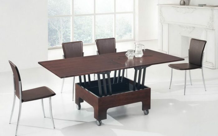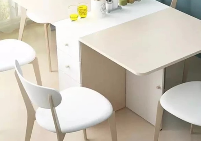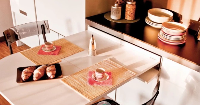 Стол-трансформер представляет собой раздвижную раскладывающуюся конструкцию. Стол кухонный раздвижной для маленькой кухни представляет собой столешницу, состоящую их двух частей и дополнительную деталь (панель). При раздвигании двух половинок между ними вставляется еще одна панель. Это позволяет значительно увеличить размер рабочей поверхности, и превратить квадратный стол в прямоугольный, а круглый стол на маленькой кухне – в овальный. В сложенном виде такой стол компактен, но подходит только для 2-4 человек. После раскладывания его можно использовать для встречи гостей, так как количество посадочных мест возрастает. Существуют и другие варианты раскладных кухонных столов для маленькой кухни. Например, полукруглый стол, который может стать круглым при поднятии и закреплении второй панели.