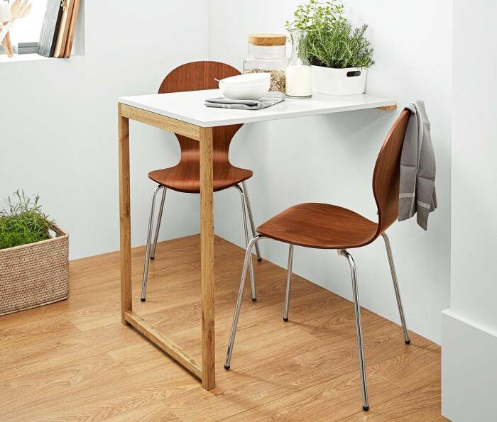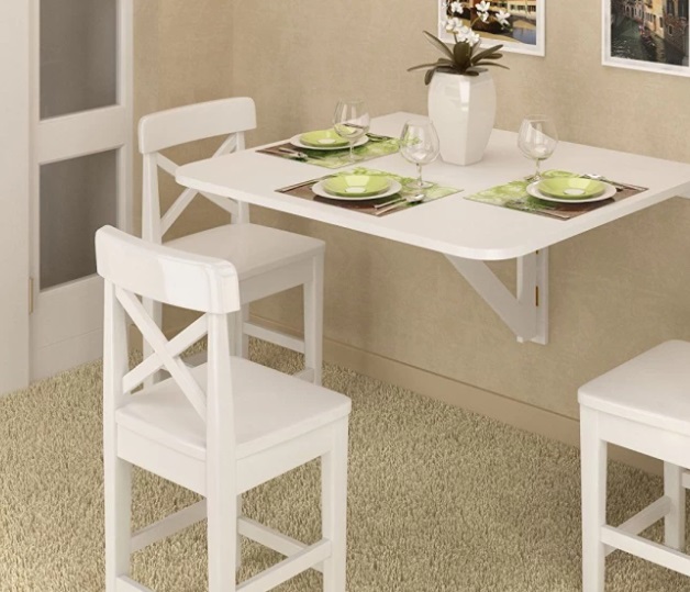Откидной вариант стола – один из способов обустройства места приема пищи в маленькой кухне. Такая столешница обычно выглядит как полукруг или прямоугольник. Если в данный момент стол не нужен, он легко убирается, не занимая место. Когда возникает необходимость, столешницу облокачивают на распорку или ножку.