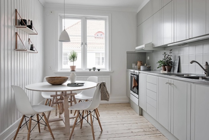 Планируя расстановку мебели в маленькой кухне, следует учитывать эргономику и функциональность предметов интерьера. Стол не желательно располагать вблизи плиты, раковины и других рабочих зон. Чем меньше площадь, тем сложнее будет организовать расстановку мебели. Для кухонь площадью около 6 или 5 кв.м. – это непростая задача. Кухня – помещение с повышенной влажностью, присутствием продуктов, и высокой вероятностью запачкивания любых поверхностей. Поэтому, делая выбор, нужно учитывать и гигиеничность покрытий, а также возможность проведения уборки, в том числе влажной.