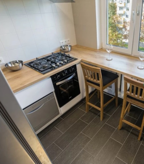 Чтобы сэкономить место, в маленьких кухнях может быть установлен стол-подоконник. Организуется такая конструкция вместо имеющегося подоконника, который придется демонтировать. При монтаже нового стола следует просчитать расстояние от сидящих за ним людей до радиатора отопления, который обычно находится под подоконником. Сам стол не обязательно должен повторять форму подоконника. Оригинально смотрятся модели с выносом, с плавными закругленными углами и продолжением, например, к соседней стене.