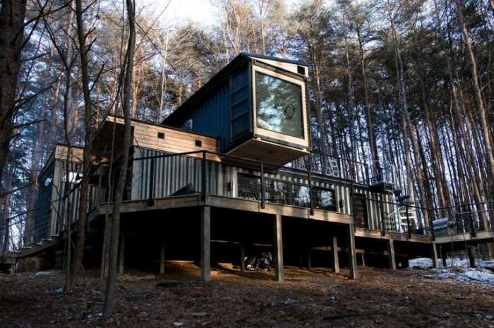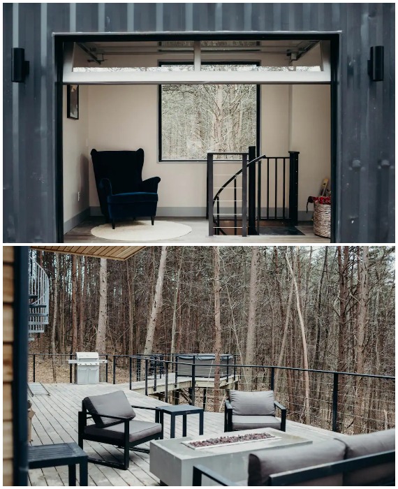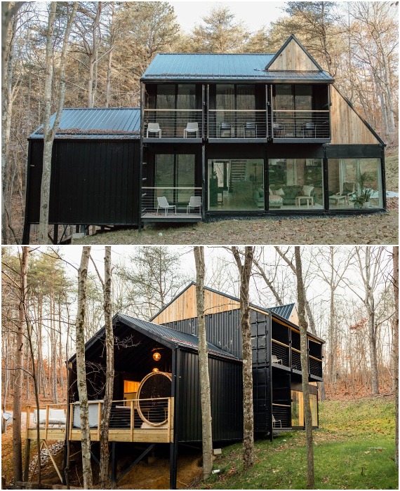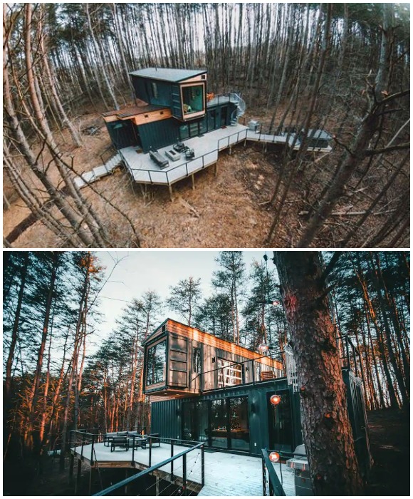 Глядя на эту лесную резиденцию сложно догадаться, что построена она на основе грузовых контейнеров (The Hygge Box Hop, США). | Фото: plainmagazine.com.