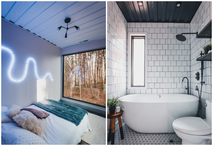 Гостиная и спальня в контейнерном гостевом доме, расположенном в глухом лесу (The Boho Box Hop, штат Огайо).