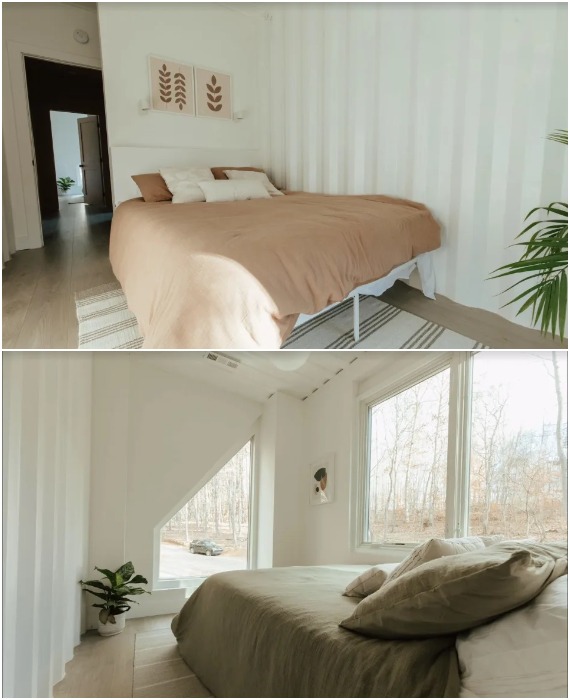 Расположенный под особым углом верхний контейнер, придал домику особую эстетику и обеспечил разносторонний обзор отдыхающим, включая потолочные люки на нижнем этаже. При проектировании внутреннего пространства увлеченные супруги именно окнам уделили особое внимание. Учитывая размер дома и характер окружающей местности, им хотелось открыть как можно большую площадь, поэтому помимо окон и световых люков на потолке были установлены масштабные стеклянные двери, пропускающие внутрь помещений много естественного света и, впуская саму природу.