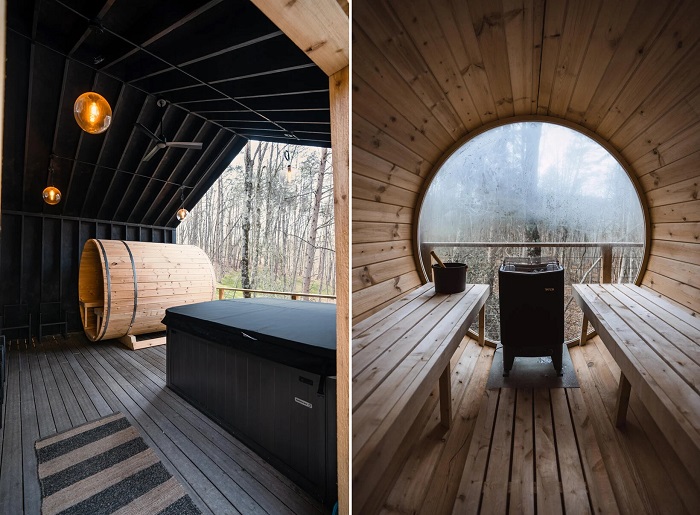 На одной из террас имеется собственная сауна и установлена гидромассажная ванна (The Hygge Box Hop, США).