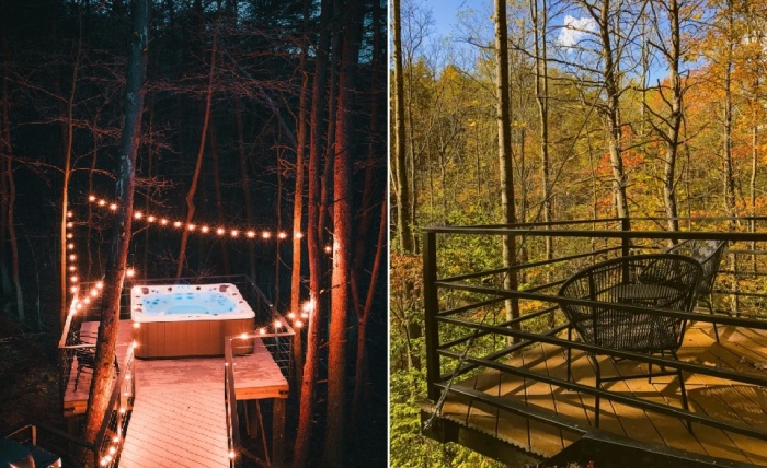 Кстати сказать, у этого лесного домика есть собственный задний дворик, расположенный на большой деревянной платформе, где можно устраивать вечеринки у костра, принимать ванны и не только воздушно-солнечные. Оказывается, на площадке установлена большая гидромассажная ванна, которую можно назвать мини-бассейном, ведь в ней помещается 6 человек.