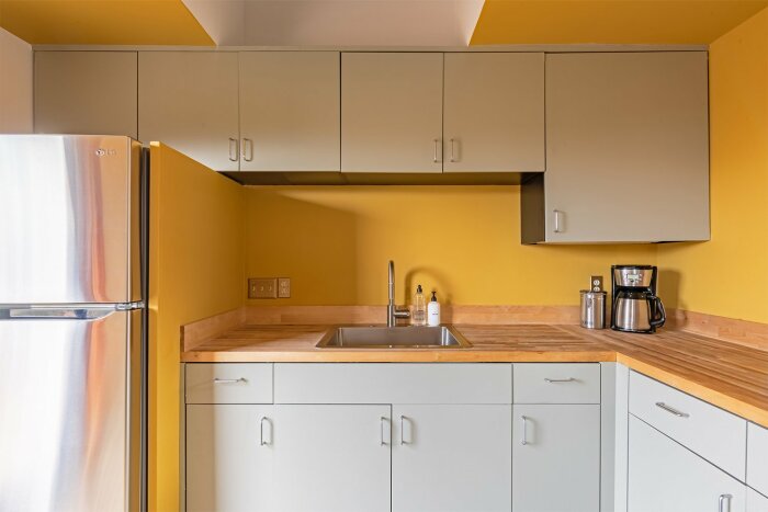 Если говорить о дизайне внутреннего пространства неординарных домиков, то такие же приглушенные цвета, только в более светлых тонах, проникают в интерьер каждой из комнат, имеющих открытую планировку и мегавысокие потолки. В гостиной, например, кресла и диваны молочно-бежевых тонов расставлены вокруг терракотово-оранжевого камина в окружении бледно-желтых стен. А вот кухня, обустроенная в стиле шеф-повара, порадует более насыщенной палитрой – горчино-желтым, песочным, бледно-серым и белым тонами. В такой же цветовой гамме оформлена столовая, имеющая оригинальную геометрию.