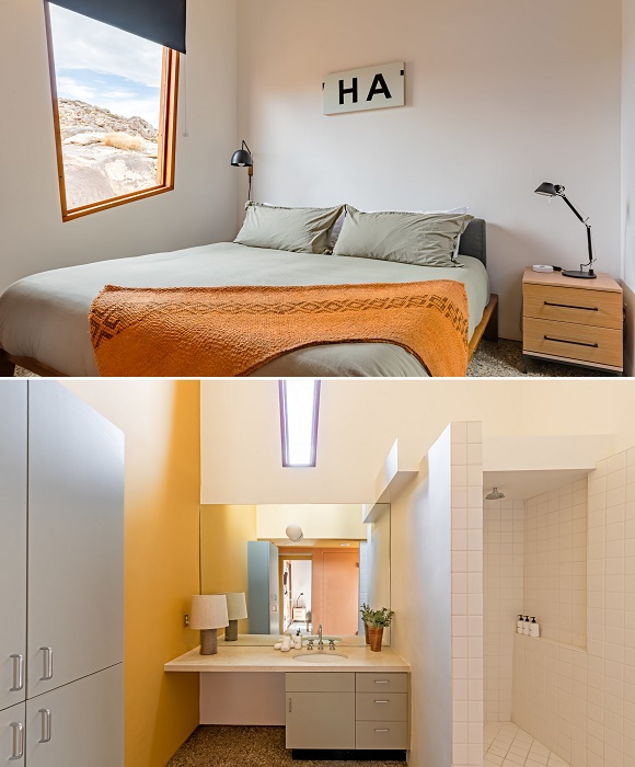 В модернистском доме, ставшем легендой архитектуры, имеется вполне реальная спальня и ванная комната (The Monument House, Joshua Tree National Park).