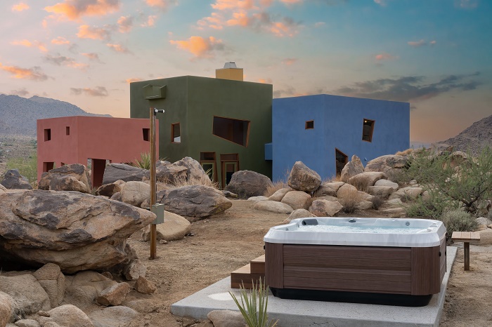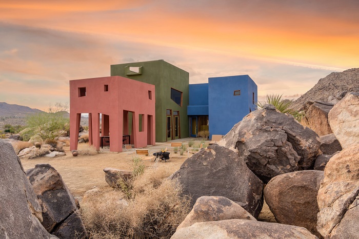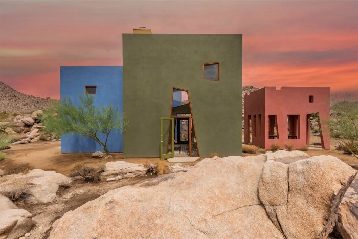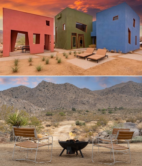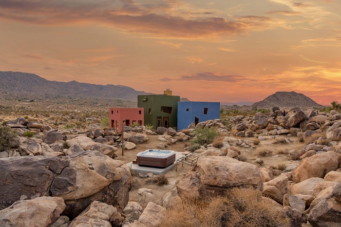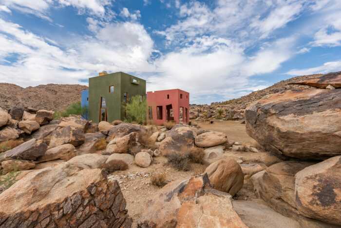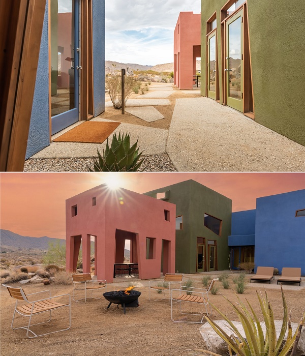 Благодаря тому, что каждый дом окрашен в приглушенные матовые тона (сине-голубой, темно-оливковый и красно-терракотовый), он не выглядит кричащим пятном, вызывая диссонанс с окружающим пейзажем. Выбор на такую палитру пал неспроста, автор проекта соотношение цветов подсмотрел у самой природы, господствующей в этой местности. «Все считают пустыню монохромной, но если приглядеться, вы увидите все эти удивительные цвета: зеленый лишайник, растущий на скале, красный цветок и невероятно синее небо», – говорил по этому поводу Джош Швейцер. Стоит отметить, что монохромность каждого объема и застекленные трапециевидные проемы (включая двери), отражающие валуны и скромную зелень, интересным образом взаимодействуют с солнцем пустыни, превращая композицию в сюрреалистичный объект.