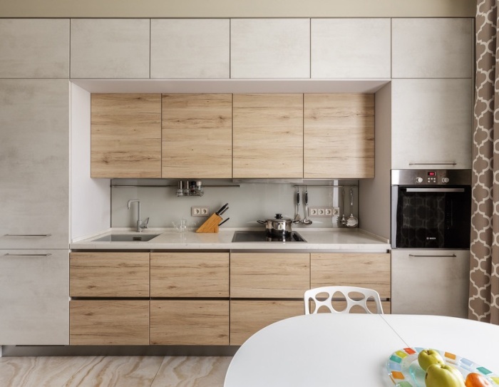 Для тех, кто хочет сэкономить, дизайнеры предлагают еще один вариант – совместить в гарнитуре бюджетный и дорогой материал. Например, верхние шкафчики, на которые приходится минимальная нагрузка, сделать из ЛДСП, а нижние, которые должны быть более прочными – из МДФ. Также можно грамотно скомбинировать их на одном уровне.