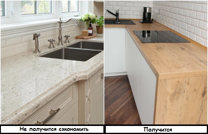 Еще одна вещь, на которой можно сэкономить без ущерба качеству кухни – это столешница. Самая дорогая производится из кварца, чуть дешевле – из искусственного камня, также популярны варианты из дерева. Но если бюджет сильно ограничен, выберите один из следующих вариантов: