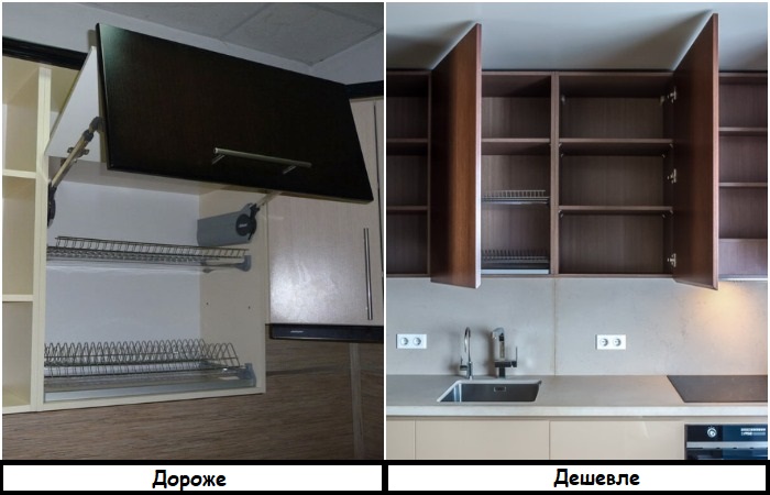 Верхние шкафчики, которые открываются наверх, а не в стороны, выглядят эффектно, но и стоят дорого. Замените такой механизм открывания обычными петлями – бюджет скажет «большое спасибо». Также можно пожертвовать ящиками с системой скрытого выдвижения, когда за одним фасадом скрываются сразу несколько. Да, это удобно и практично, но самые обычные ящики тоже не лыком шиты – они на совесть выполняют все свои функции.