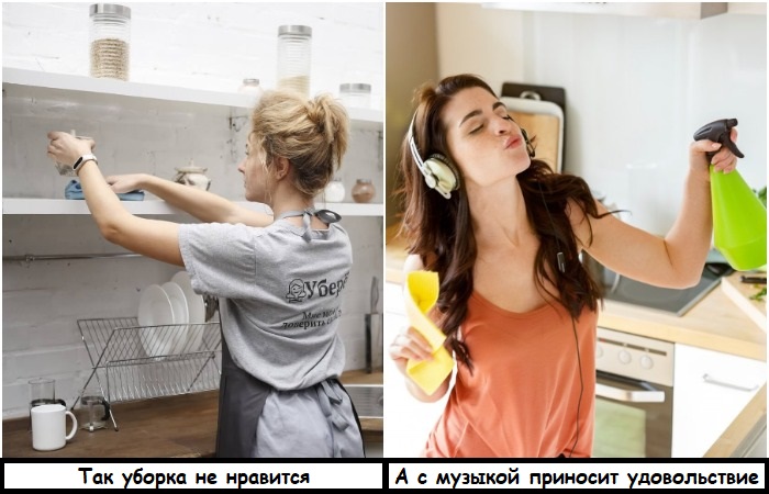 Бывают ситуации, когда угнетает сам процесс уборки, причем совсем не важно, что именно вы должны сделать и в какой комнате. В этом случае попробуйте обмануть мозг и совместить наведение порядка с чем-то приятным. Например, можете включить для фона любимый сериал или энергичную музыку, позвонить подруге, с которой вы обычно болтаете не меньше часа (для удобства вставьте в уши наушники). Также пообещайте себе какую-нибудь награду после уборки: вкусный десерт, поход в кино, шопинг – такая мотивация отлично работает.