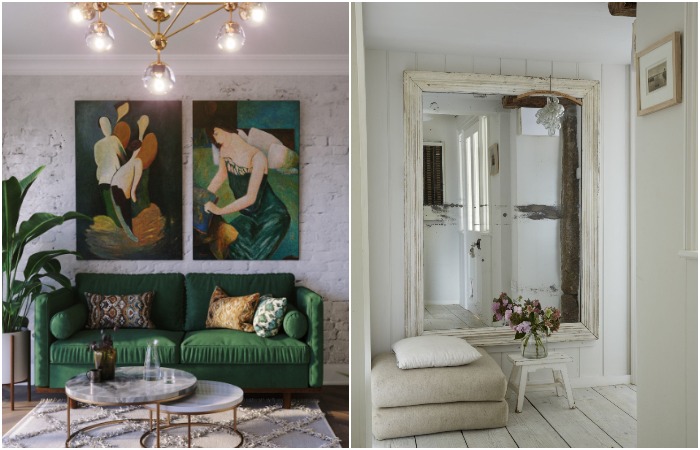 Картины над диваном и винтажное зеркало в раме - прекрасные акценты