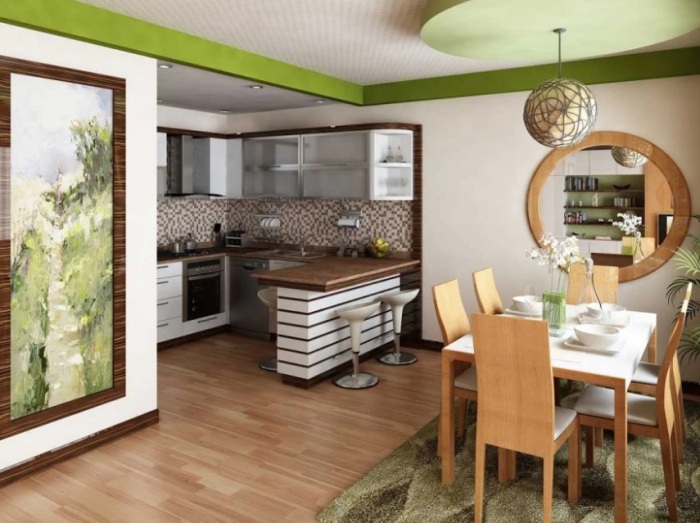 • Тканевые ширмы. Не очень практичный вариант для кухни, потому что на материал могут попасть брызги жира, и он потеряет вид. Если выбираете этот способ, рассмотрите перегородки из водо- и грязеотталкивающих тканей. • Подиум. Предполагается, что в одной части помещения будет небольшой выступ, где расположатся барная стойка, остров или обеденный стол. Однако чаще всего подиум для зонирования используют в совмещенных помещениях. Например, столовой-гостиной. • Зонирование текстилем. Например, в обеденной зоне можно постелить на пол красивый ковер. Аксессуар поможет создать контраст между участками. • Зонирование цветом. Суть хитрости в том, чтобы оформить рабочую зону кухни в одном тоне, обеденную - в другом. Рассматривайте для такого дизайна оттенки, которые идеально гармонируют между собой. Обычно этот прием редко используют автономно, поэтому можно с его помощью усилить эффект от другой техники.