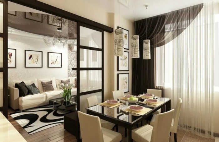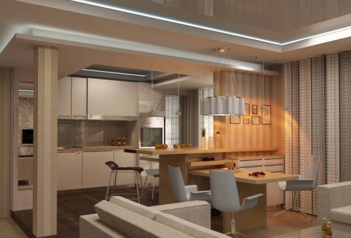 • Зонирование светом. Этот прием позволяет визуально разделить помещения на участки с помощью разных схем освещения. Например, над барной стойкой можно повесить оригинальные лампы на длинных шнурах или цепочках. Рабочую зону легко выделить с помощью светильников, встроенных прямо в фасады мебели. Смело комбинируйте разные способы. Например, зонирование светом и цветом, подиум и текстиль. Самыми самодостаточными методами считаются ширмы и перегородки. Можете остановиться только на них.