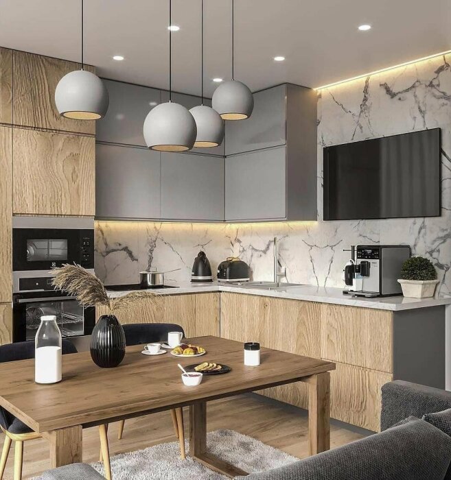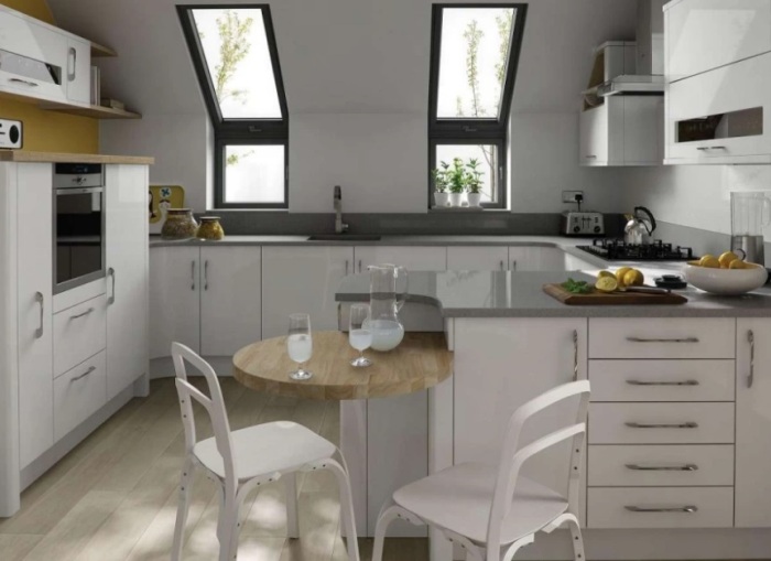 Г-образная или угловая планировка кухни выручит, если физически невозможно разместить всю мебель у одной стены. В этом случае предметы будут располагаться вдоль двух смежных поверхностей. Такой вариант подойдет как для миниатюрной, так и для просторной кухни. Г-образное расположение мебели удобно с точки зрения фэн-шуй. Получится идеальный рабочий треугольник, где все под рукой. Для угловой планировки потребуется специальный кухонный гарнитур. Если вы не планировали его приобретать, постарайтесь грамотно расположить мебель, которая уже имеется. Шкафы и подвесные полки придвиньте вплотную к углу, чтобы каждый сантиметр был задействован с пользой. Обеденную группу из стола и стульев лучше разместить в центре помещения. Такое расположение отлично рифмуется с Г-образной планировкой и создает ощущение наполненности пространства.