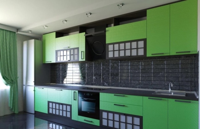 Самая простая и распространенная планировка. Иначе ее называют однорядной, потому что мебель на кухне будет располагаться вдоль длинной стены. Такая планировка подходит для небольших кухонь площадью 4-6 кв.м. Вы сможете грамотно организовать рабочее пространство и оставить свободное место в центре помещения. У такой планировки есть существенный минус - минимализм в обстановке. Если мебели и предметов будет слишком много, создастся ощущение захламленности. Поэтому лучше обойтись универсальным гарнитуром, которые уже включает свободную поверхность для приготовления пищи. Если некуда поставить плиту, отдайте предпочтение варочной поверхности. Конструкция идеально впишется в линейную планировку. Обеденный стол тоже можно разместить вдоль стены. Однако если есть свободное пространство у окна, лучше поставить мебель туда.