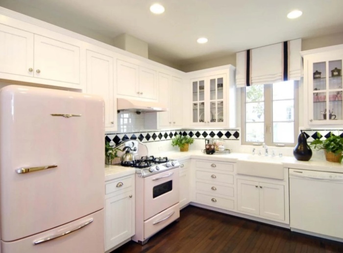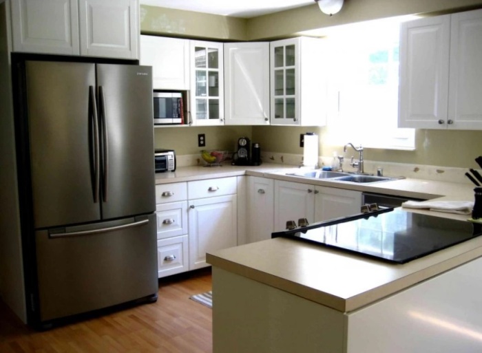 Эргономичный интерьер маленькой квадратной кухни. / Фото: houzz.ru • Продумайте расположение холодильника относительно плиты. Нормы безопасности строго запрещают размещать прибор для хранения продуктов рядом с нагревающимися поверхностями. В противном случае холодильник быстро выйдет из строя. Лучше установить прибор на противоположной от плиты стороне или встроить его между модулями гарнитура. Если такой возможности нет, технику целесообразно вынести в коридор. • Задействуйте ниши. Если на стенах кухни есть углубления, учтите их при планировке. Там можно разместить неглубокие шкафы или полки для хранения специй, декора и других мелочей. • Купите компактные предметы для маленькой кухни. Если комната небольшая, обратите внимание на уменьшенную технику. В продаже есть узкие холодильники, миниатюрные микроволновки и посудомоечные машины. Откажитесь от лишних предметов. Например, стиральной машинки. Такую технику логичнее установить в коридоре или санузле. В маленькой кухне она будет занимать пространство и выглядеть неуместно. • Решите судьбу дверных проемов. При необходимости их можно перенести, сузить или расширить. Двери устанавливать не обязательно - можно обойтись ширмами и перегородками. Однако и эти элементы будут лишними, если вы хотите, чтобы одно перемещение плавно перетекало в другое.