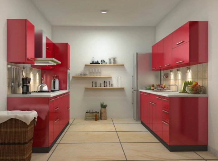 Двухрядная планировка кухонного гарнитура подразумевает, что мебель окажется вдоль противоположных длинных стен. Этот вариант подходит для просторных прямоугольных помещений. Минимальная площадь кухни для воплощения задумки - 8 кв.м. Однако параллельная планировка нежелательна для слишком больших пространств. В очень габаритных комнатах придется тратить много времени на перемещение от одной функциональной зоны до другой. Не обязательно закрывать мебелью всю длину стен. Чаще всего размера шкафов хватает только на половину поверхности. Для равновесия в противоположном конце кухни можно поставить обеденную группу. Тогда в комнате будет отдельная зона столовой и функциональный уголок для приготовления пищи.