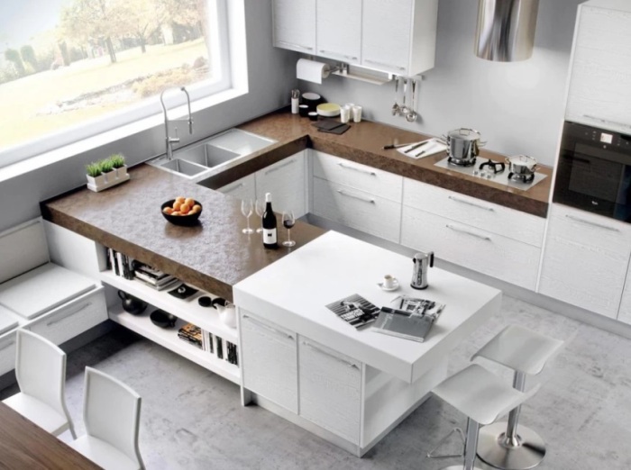 Полуостровная планировка одновременно похожа на островную и линейную. Она выручит, если кухня не слишком большая и нецелесообразно занимать центр помещения. Главным атрибутом обстановки станет полуостров - небольшой стол, который одним торцом упирается в стену. Альтернативный вариант - совмещение такой мебели с барной стойкой. В этом случае можно исключить из интерьера обеденную группу.