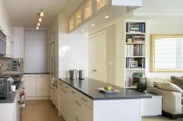 Удачный пример планировки узенькой кухни. / Фото: kitchensecrets.com