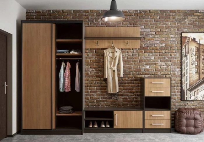 По типу строения шкафы делятся на встроенные и отдельностоящие: • Встроенная гардеробная. Она в прихожей представляет собой полки, ящики и иное оснащение шкафа, расположенное в нише или между стенами. Такой вариант гардеробной позволяет экономить пространство, используя максимально функционально каждый квадратный метр, а визуально не скрадывает площадь помещения. Внутренняя комплектация разрабатывается индивидуально, учитывая все ваши потребности. При планировании встроенной конструкции большое значение имеет правильная геометрия стен-оснований. В случае, если обнаружены недостатки, установка дверей может вызвать трудности. В таком случае исправить это возможно, расположив в нише мебельный каркас, который будет являться основой для расположения полок, вешал и дверей шкафа.