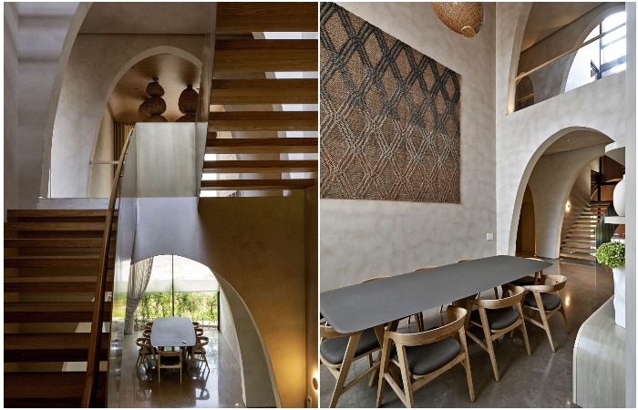 Столовая находится в двухуровневом объеме (Mirai House of Arches, Индия).
