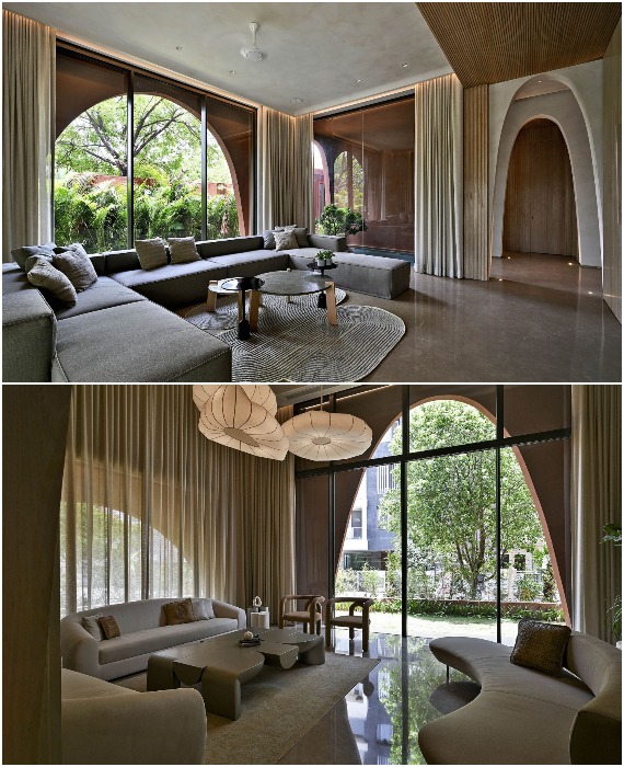 Гостиные оформлены в современном стиле, где в приоритете простор и стильная мебель (Mirai House of Arches, Индия).