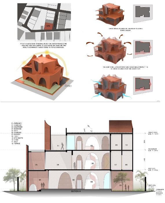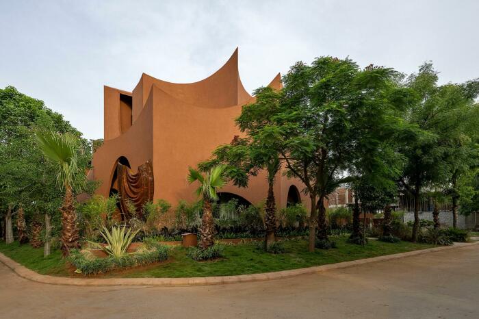 Специалисты дизайнерской студии Sanjay Puri Architects из Мумбаи завершили строительство инновационного жилого дома в раджастанском городе Бхилвар, который выделяется на фоне городской застройки. Но не только эффектные формы и яркие цвета стали отличительной чертой реализованного проекта, первоочередной задачей которого, стало решение проблем, связанных с климатическими условиями, ведь в этом регионе 8 месяцев в году температура воздуха не снижается ниже + 40 градусов. А близость пустыни Тар наполняет пространство очень сухим воздухом, досаждающим не только на городских улицах. Mirai House of Arches («Дом арок Мирай»), именно так называется новый жилой дом, расположенный на угловом участке в 6 соток, частично окружен тротуаром и мало оживленной дорогой, что также наложило отпечаток на ориентацию дома и оформление двора.